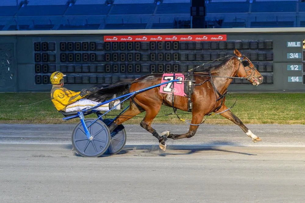 Thiskissformaryell continued his impressive form in the Delaware Standardbred Breeders’ Fund (DSBF) series, winning the second of two $20,000 first-round divisions for 2-year-old male trotters at Bally’s Dover on Tuesday, November 11. Driven by Jim Morand, Thiskissformaryell took an early lead from post 7, with Prime Yield, driven by Art Stafford Jr., following closely behind. The gelding increased his advantage steadily and finished the mile in 2:01.